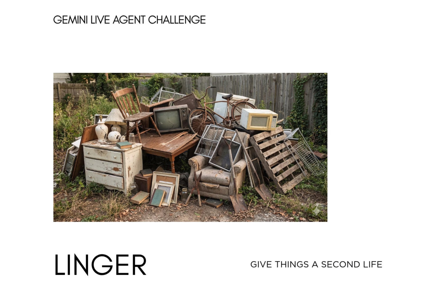 Linger is a mobile-first multimodal agent that helps people reimagine household items before they become waste. Instead of starting from an empty prompt box, Linger starts from the camera: it studies a real object, scans the surrounding room for real constraints and opportunities, and turns that evidence into a short, grounded 15–30 second story reel.